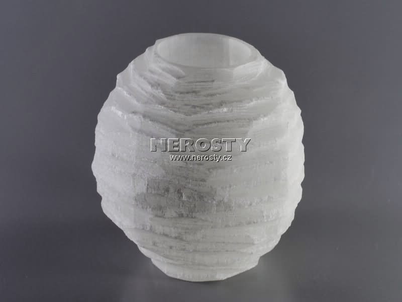 Svícen na čajovou svíčku ve tvaru šišky z bílého štípaného selenitu. |
