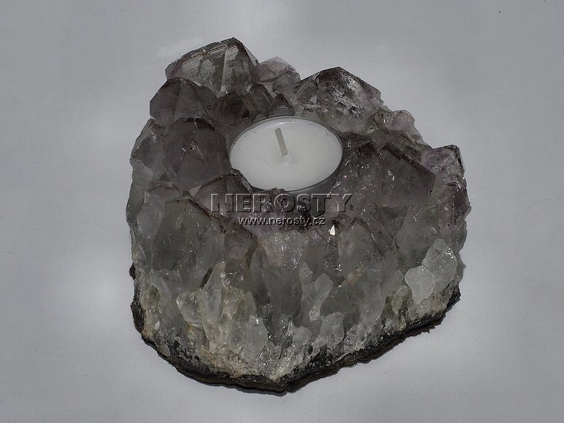 Svícen na čajovou svíčku vyrobený z ametystové drúzy. |
