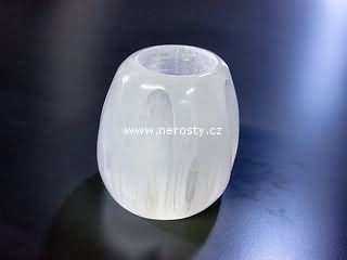 Svícen na čajovou svíčku. Leštěný a ornamentálně zdobený selenit. |