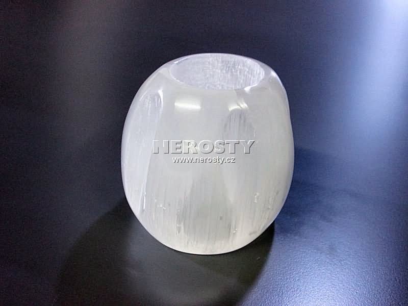 Svícen na čajovou svíčku. Leštěný a ornamentálně zdobený selenit. |