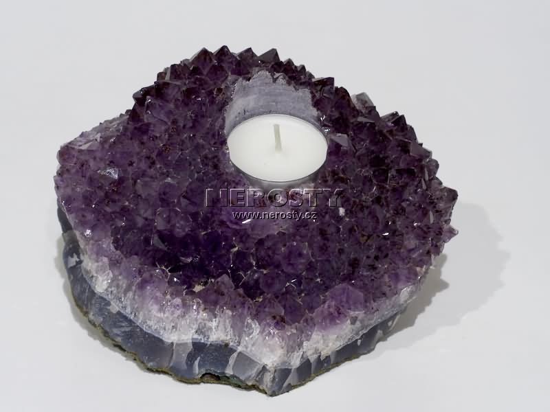 Svícen na čajovou svíčku vyrobený z tmavší ametystové drúzy. |