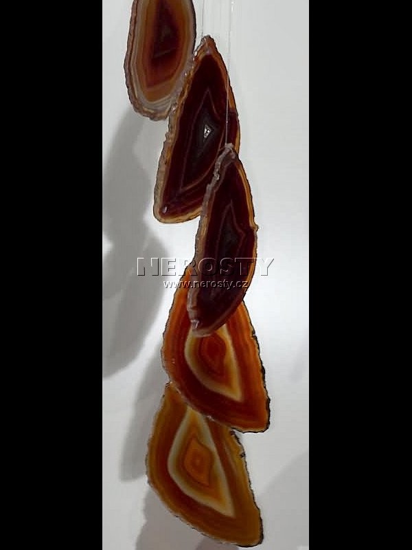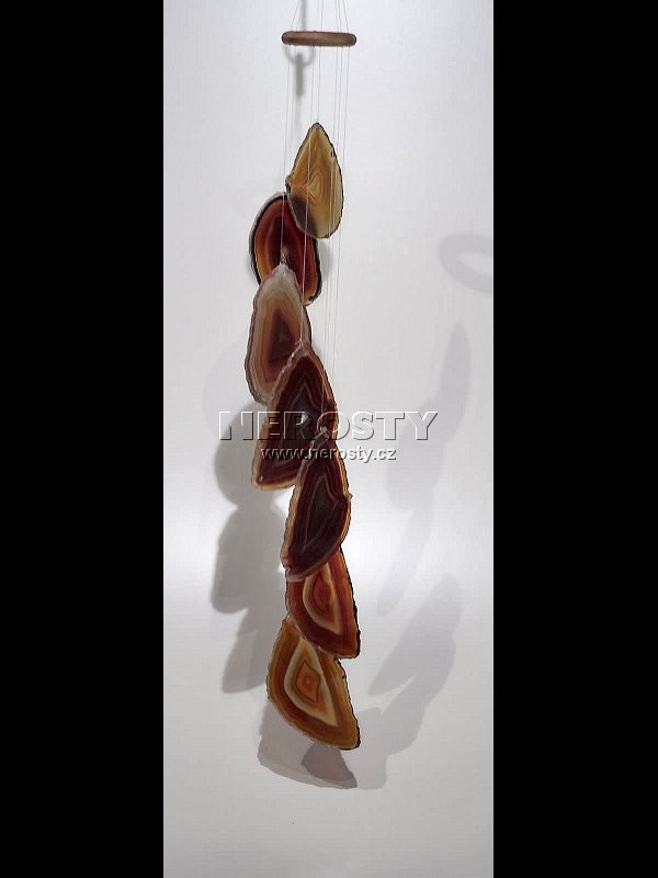 Zvonkohra z přibarvených achátových plátků.Zvonkohra je vyrobena z přibarvovaných, původně šedých až béžových, achátových plátků. Vzhledem k tomu, že jejich pestré barvy na slunci blednou, nedoporučujeme její zavěšení na osluněné místo.