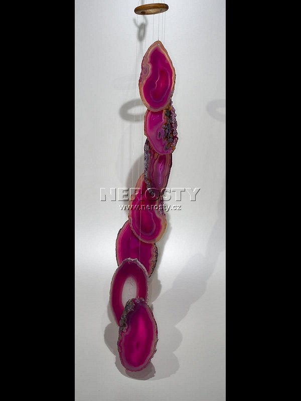 Zvonkohra z přibarvených achátových plátků.Zvonkohra je vyrobena z přibarvovaných, původně šedých až béžových, achátových plátků. Vzhledem k tomu, že jejich pestré barvy na slunci blednou, nedoporučujeme její zavěšení na osluněné místo.