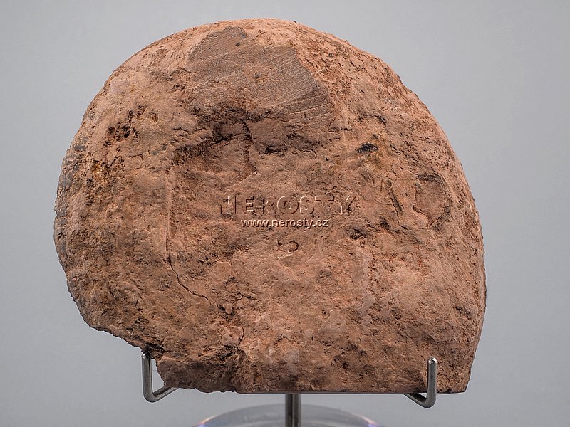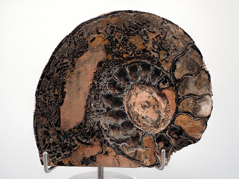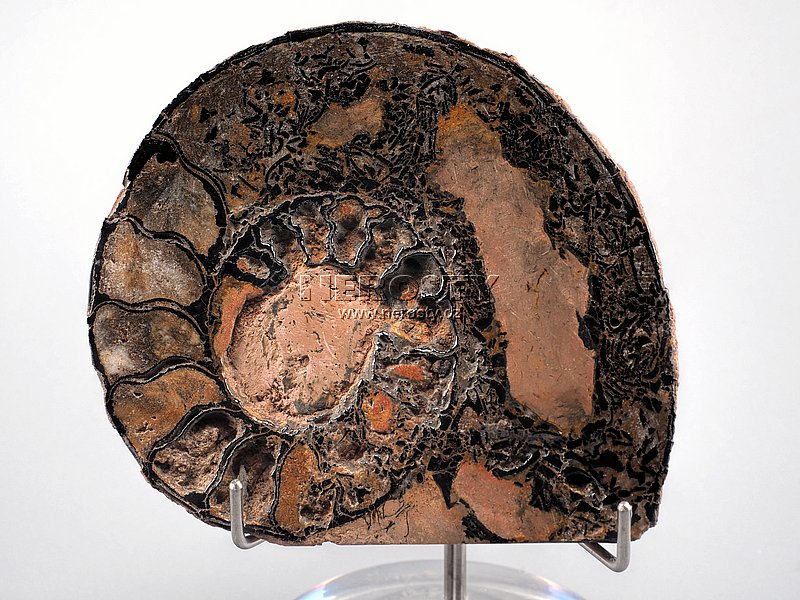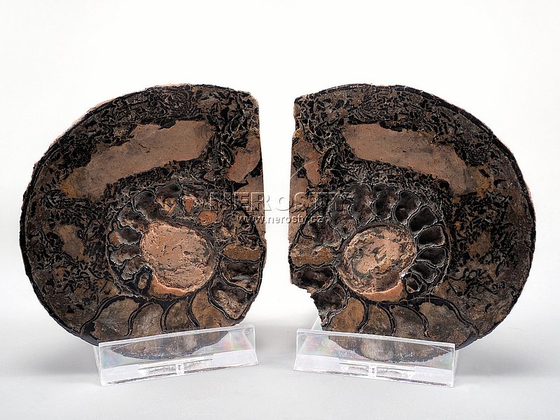 Na dvě poloviny rozříznutý a leštěný neurčený limonitizovaný amonit.Druhohory, křída, stáří 145 - 66 miliónů let.