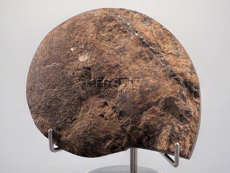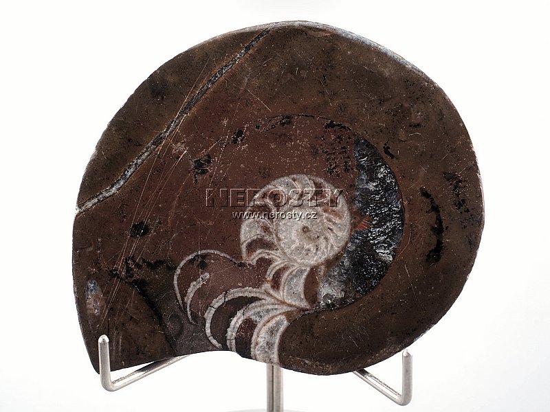 Na dvě poloviny rozříznutý a leštěný neurčený zkamenělý amonit..Uvedené rozměry platí pro levou polovinu, hmotnost pro kompletní zkamenělinu.