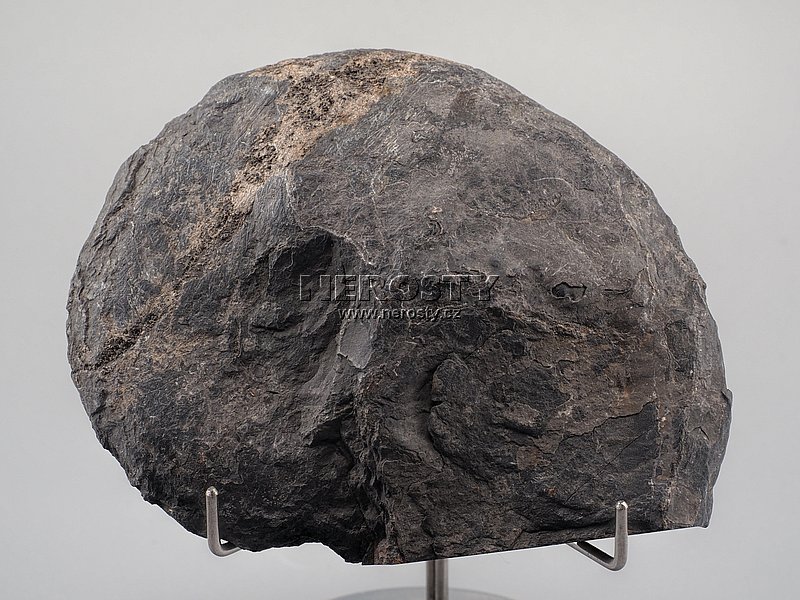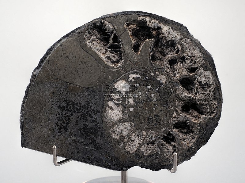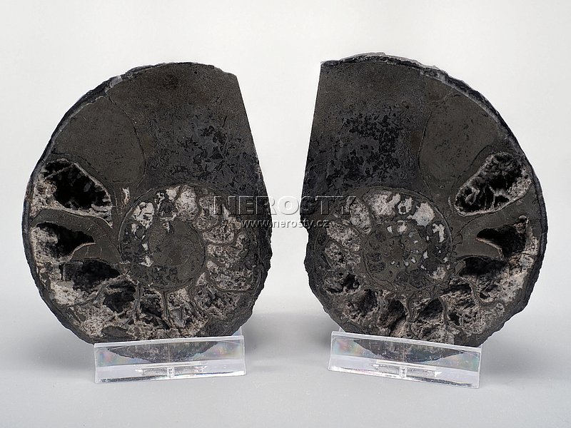 Původní schránka amonita je impregnována pyritem, v dutinách žeber je drobně krystalovaný kalcit. Uvedené rozměry platí pro levou polovinu, hmotnost pro kompletní zkamenělinu. |