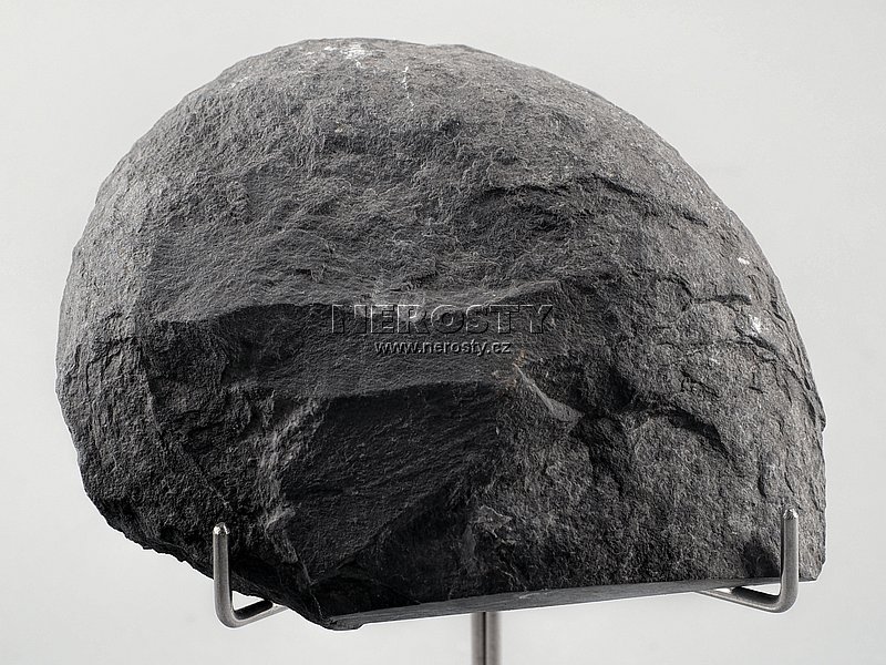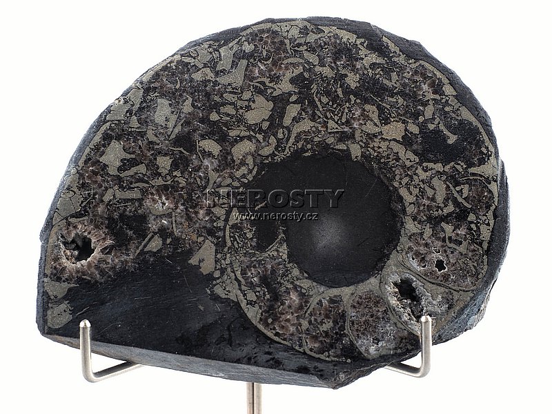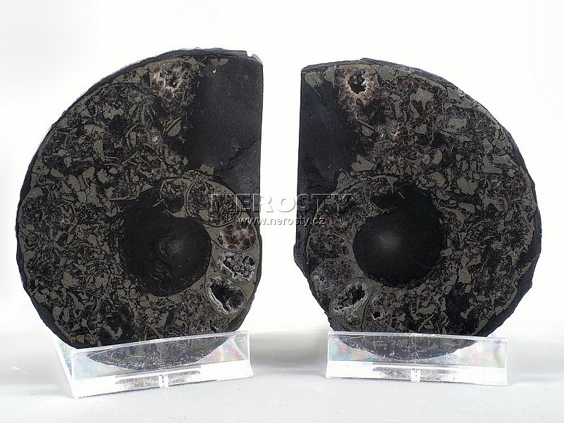 Původní schránka amonita je impregnována pyritem, v dutinách žeber je drobně krystalovaný kalcit. Uvedené rozměry platí pro levou polovinu, hmotnost pro kompletní zkamenělinu. |