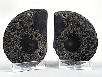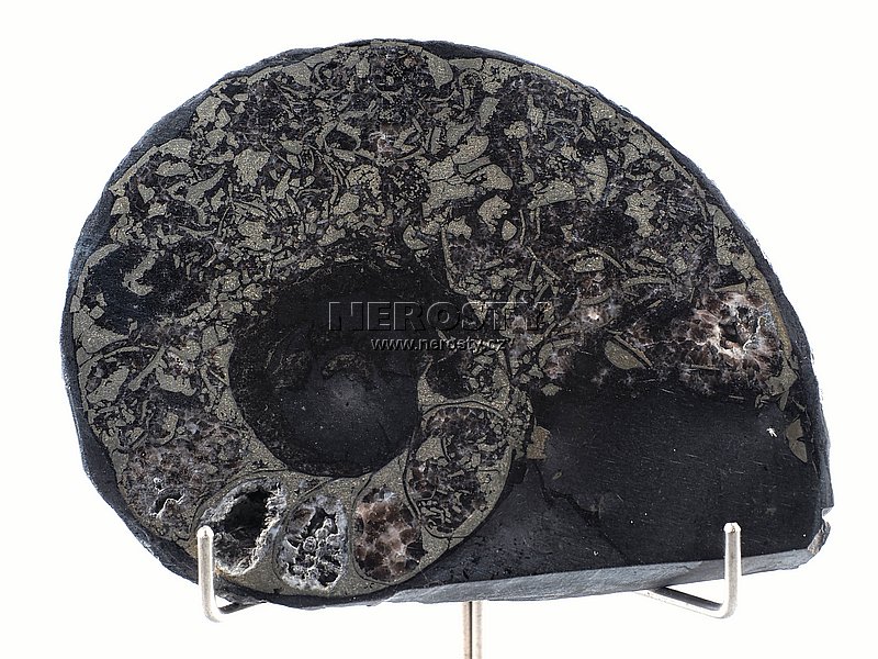 Na dvě poloviny rozříznutý a leštěný neurčený pyritizovaný amonit.Druhohory, křída, stáří 145 - 66 miliónů let.