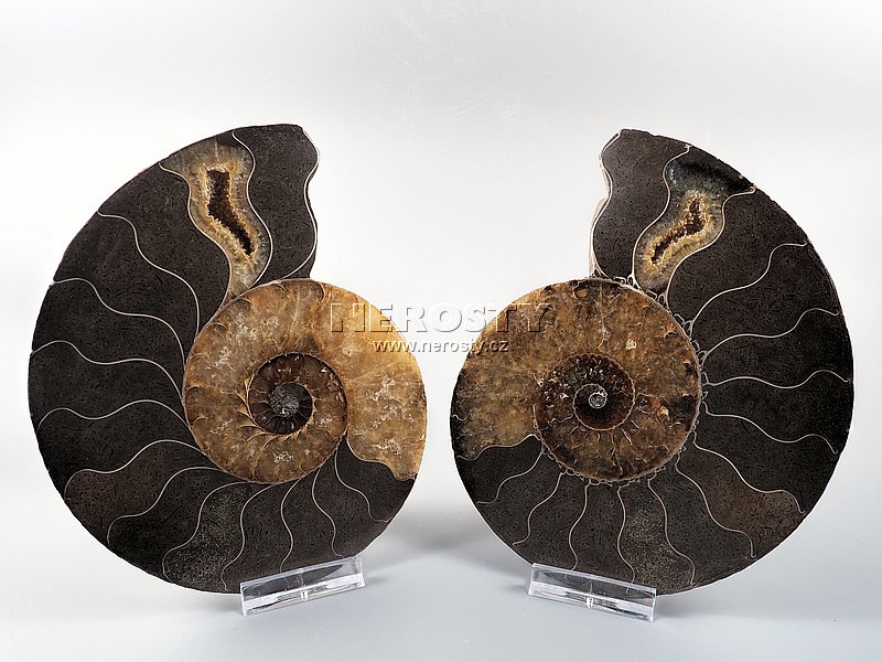 Na dvě poloviny rozříznutá a leštěná zkamenělina amonita cleoniceras sp. s dobře patrnou vnitřní strukturou.Hloubka je změřena při složené fosílii.