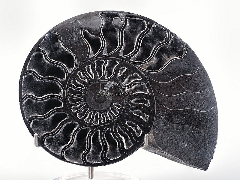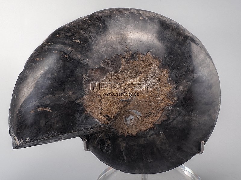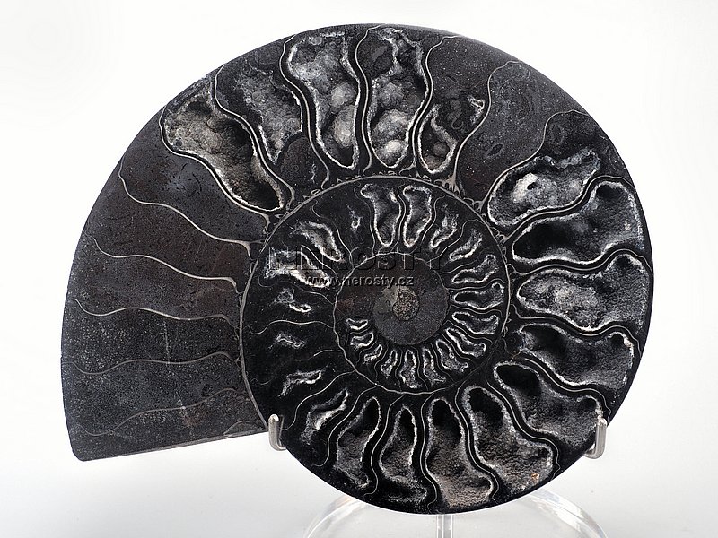 Na dvě poloviny rozříznutá a leštěná kontrastní zkamenělina amonita cleoniceras besairei s dobře patrnou vnitřní strukturou.Atraktivní kontrastní vzhled a jeho tmavá barva je s největší pravděpodobností výsledkem působení manganu.