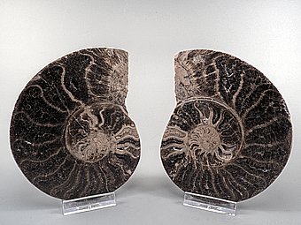 Na dvě poloviny rozříznutý a leštěný zkamenělý amonit choffaticeras segne.Druhohory, křída, stáří 92 – 88 miliónů let.