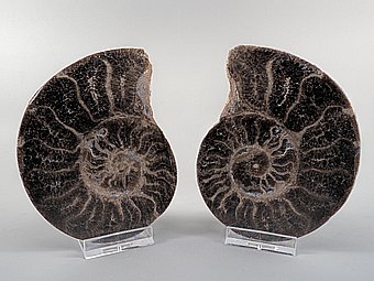 Na dvě poloviny rozříznutý a leštěný zkamenělý amonit choffaticeras segne.Druhohory, křída, stáří 92 – 88 miliónů let.