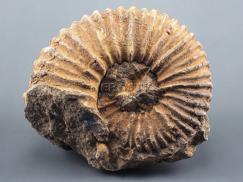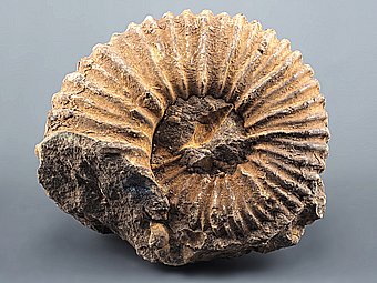 Zkamenělá schránka amonita z období jury.Druhohory, jura, stáří 200 - 145 miliónů let.