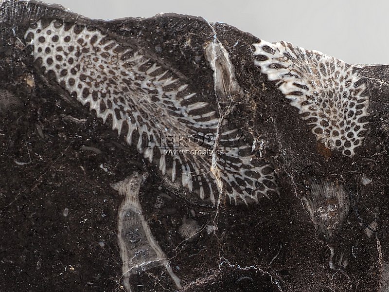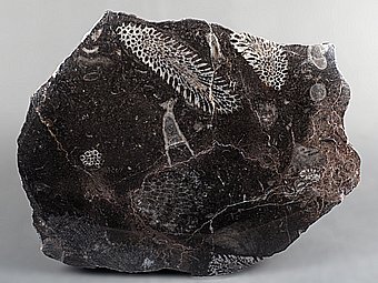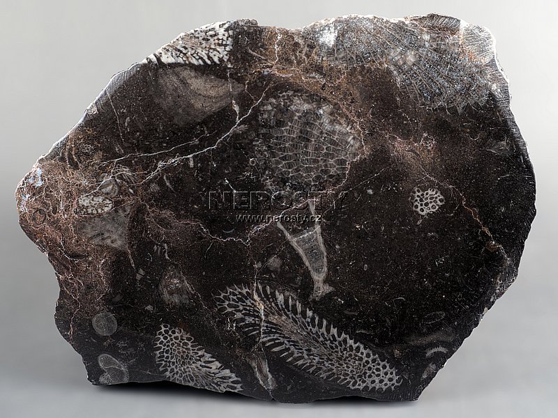 Prvohorní korál, zarostlý v naleštěném bloku horniny. |