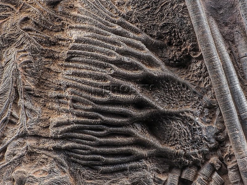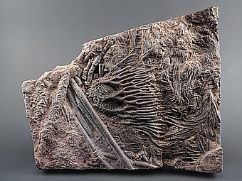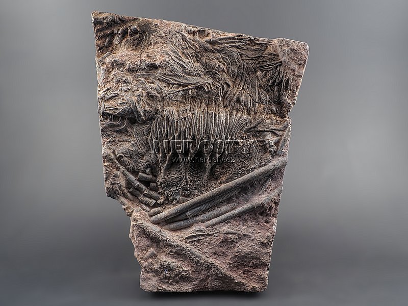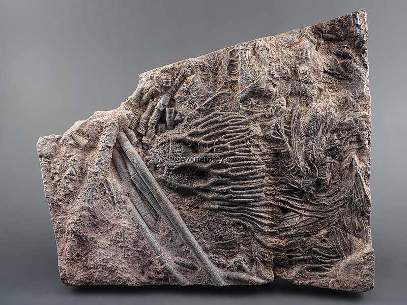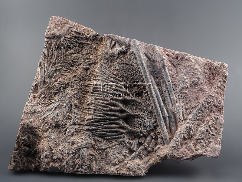 Rekonstruovaná zkamenělina prvohorního crinoidu.Zkamenělý mořský živočich. Prvohory, devon, stáří ~400 miliónů let.