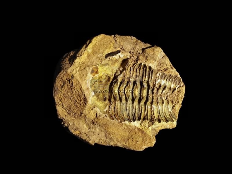 Prvohory, ordovik, stáří 505 - 438 miliónů let. Kompletní konkrekce s trilobitem uvnitř.Tento druh trilobita je označován jako diacalymene ouzregui (synonimum flexicalymene ouzregui).