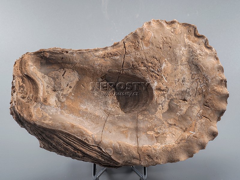 Zkamenělá schránka neurčené druhohorní ústřice.Druhohory, trias, stáří orientačně 145 milionů let.