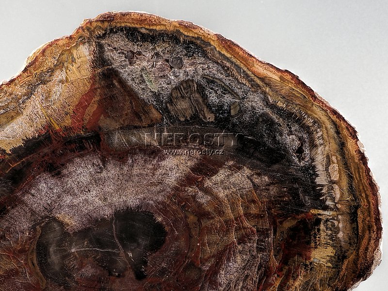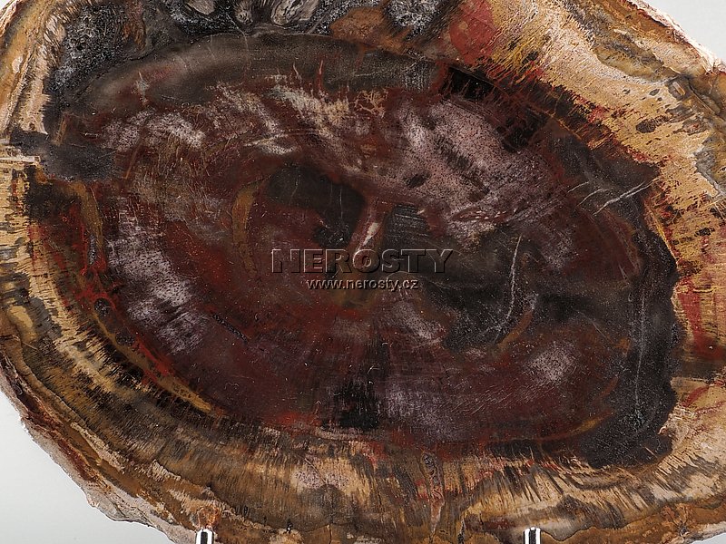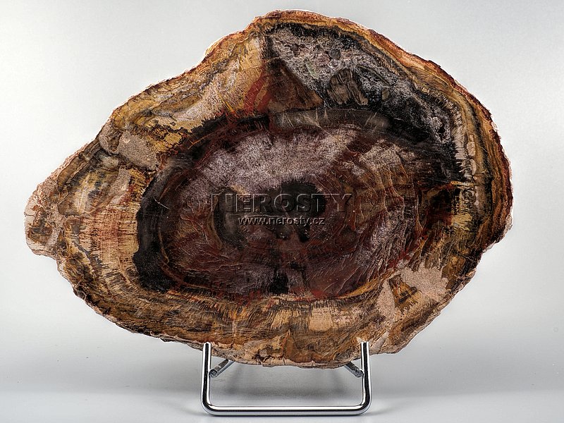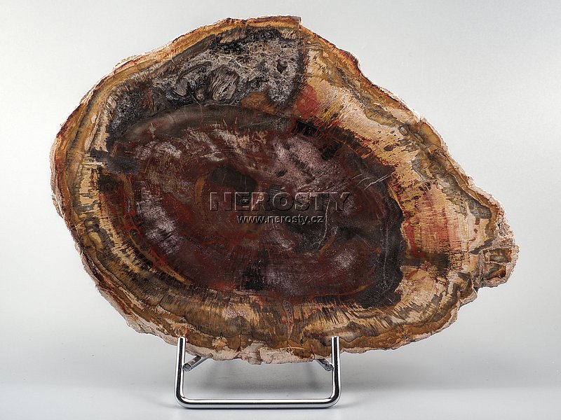 Plátek z pestrobarevného zkamenělého dřeva, pravděpodobně araukárie, původem z Madagaskaru.Oboustranně leštěný plátek je výřezem z většího kusu třetihorního zkamenělého dřeva starého přibližně 220 milionů let. Obvod plátku je ponechán v přírodním stavu. Materiál věrně zobrazuje původní dřevěnou strukturu včetně jasně viditelných letokruhů a suků.