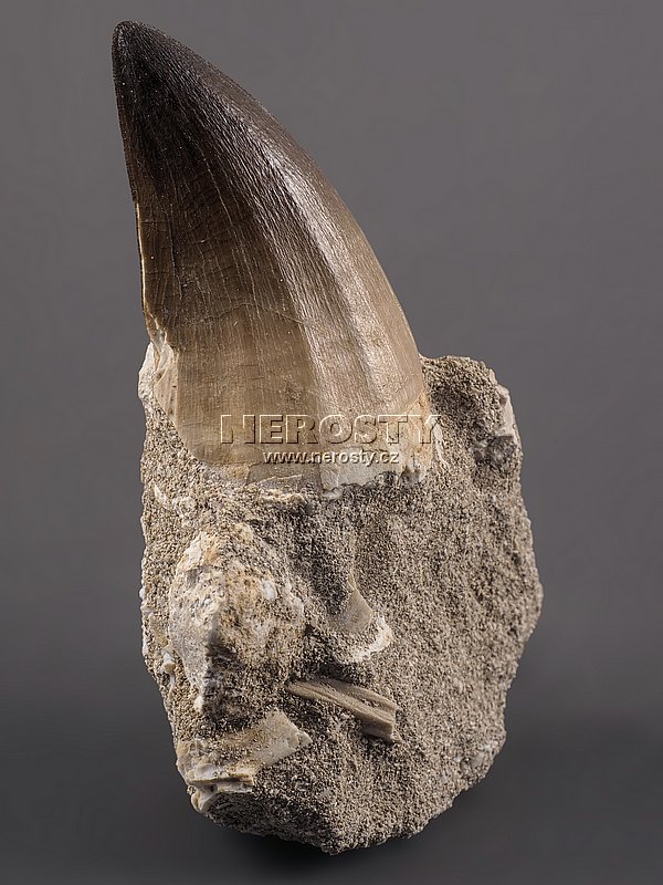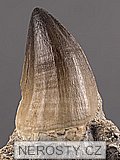 Zub dravého ještěra zarostlý v hornině.Fosílie zubu na fosfátové podložce. Délka vlastního zubu je 5 cm.
