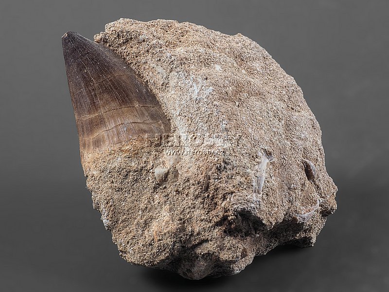 Zub dravého ještěra zarostlý v hornině.Fosílie je zarostlá v originální poloze na fosfátové podložce.