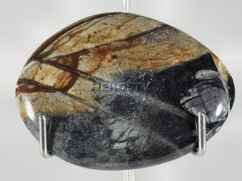 Plochý oboustranně leštěný kus jaspisu. Díky svému abstraktnímu vzoru je označován jako picasso jaspis. |