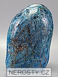 Vetší, volně tvarovaný a leštěný kus skvrnitého sytě modrého apatitu s opravdu dobrou barvou.Podstava je seříznuta a lze jej na ni postavit. Může sloužit i jako těžítko.