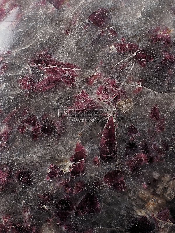 Volně leštěný kus směsi lepidolitu a rubelitu s intenzivně růžovou až fialovou barvou.Světlejší partie jsou tvořeny křemenem a živcem. Podstava je lehce seříznuta a lze jej na ni postavit. Může sloužit i jako těžítko.