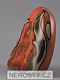Volně tvarovaný a leštěný kus pastelově pestrobarevného jaspisu s výraznou kresbou.Podstava je lehce seříznuta a lze jej na ni postavit. Může sloužit i jako těžítko.