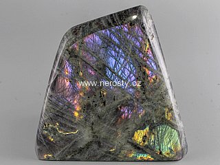Leštěný volně tvarovaný kus pestrobarevného labradoritu, tzv. spektrolitu.Labradorit s tímto vybarvením (lze na něm najít všechny barvy duhy) má obvykle méně výraznou a hůře patrnou barvoměnu než je tomu u klasických modrých či zlatých kusů a jeho základní barva je světle šedá. Tento labradorit má seříznutou podstavu a je stabilně stojící.