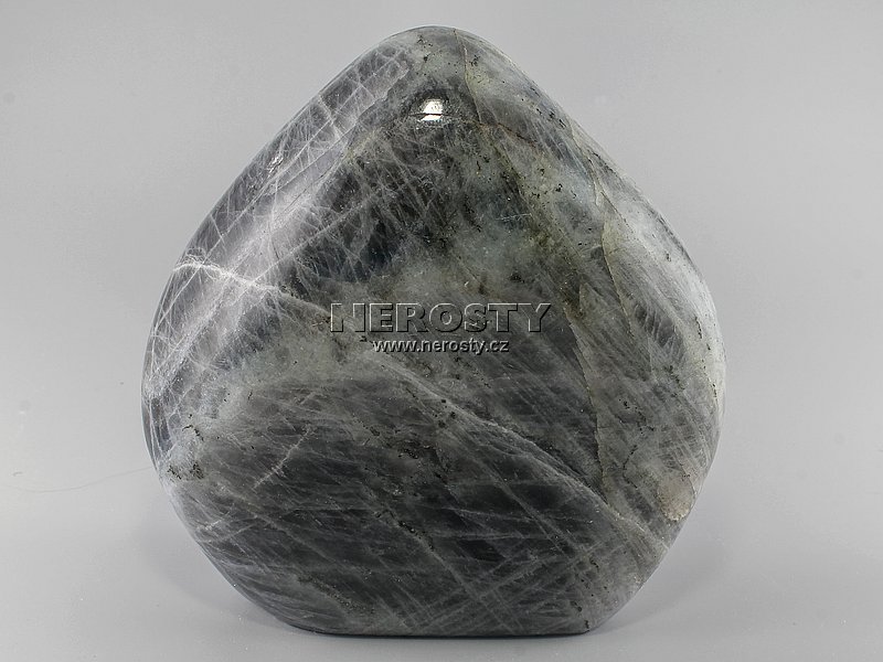 Leštěný volně tvarovaný kus fialového tzv. purple rain labradoritu.Labradorit s tímto vybarvením má obvykle méně výraznou a hůře patrnou barvoměnu než je tomu u klasických modrých či zlatých kusů a jeho základní barva je světle šedá. Tento labradorit má seříznutou podstavu a je stabilně stojící.