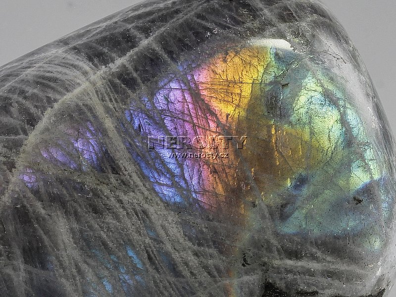Leštěný volně tvarovaný kus pestrobarevného labradoritu, tzv. spektrolitu.Labradorit s tímto vybarvením (lze na něm najít všechny barvy duhy) má obvykle méně výraznou a hůře patrnou barvoměnu než je tomu u klasických modrých či zlatých kusů a jeho základní barva je světle šedá. Tento labradorit má seříznutou podstavu a je stabilně stojící.