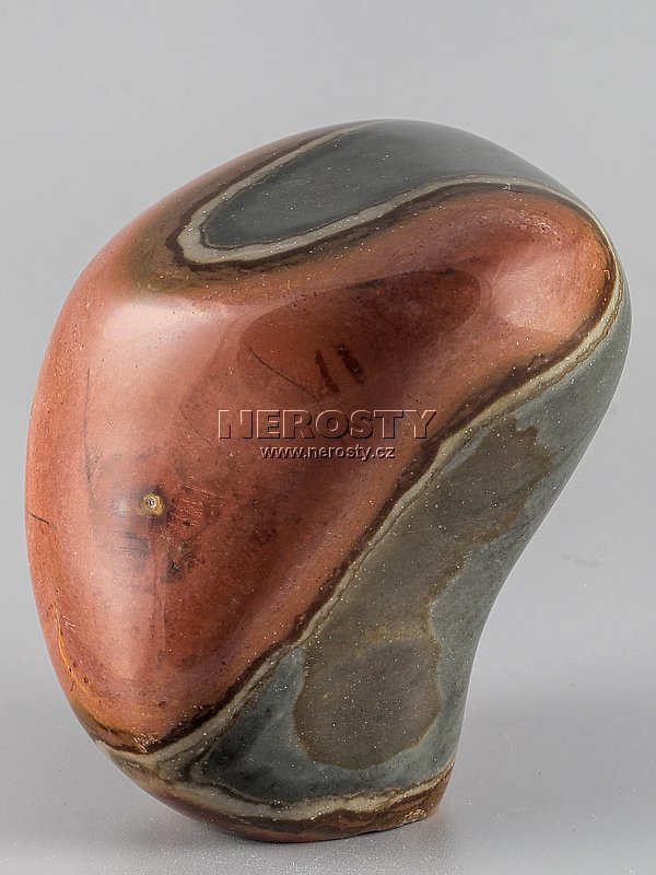 Volně tvarovaný a leštěný pestrý kus pestrobarevného jaspisu s výraznou kresbou.Podstava je lehce seříznuta a lze jej na ni postavit. Může sloužit i jako těžítko.
