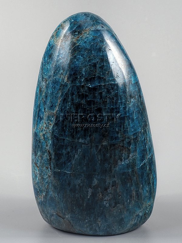 Volně tvarovaný a leštěný kus modrého až modrozeleného apatitu.Podstava je seříznuta a lze jej na ni postavit. Může sloužit i jako těžítko.