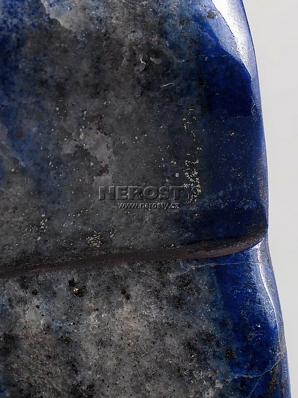 Volně stojící leštěný kus dobře vybarveného lapisu připomínající plamen.V tmavě modrém lapisu jsou tu a tam zarostlá zrnka pyritu.