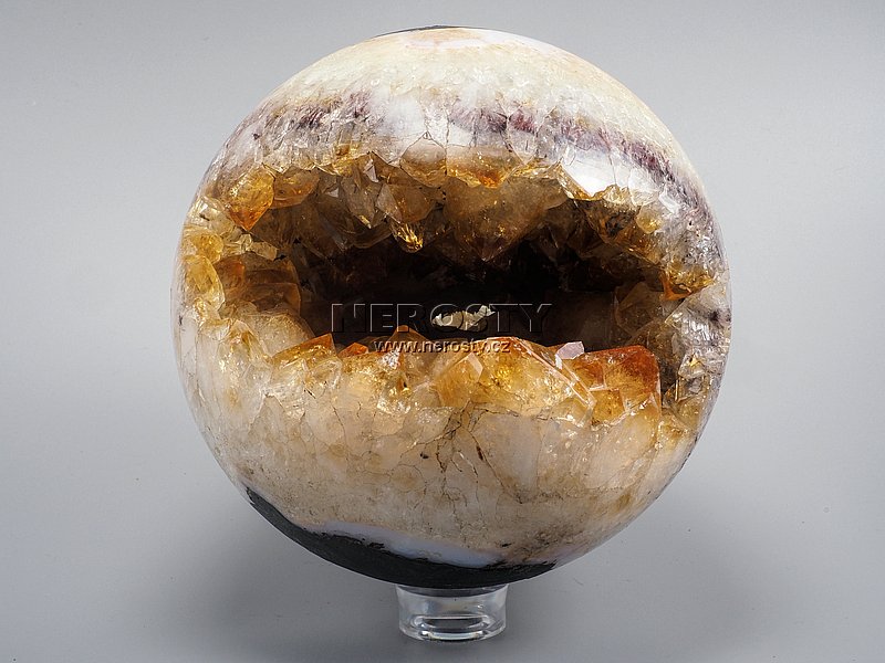 Koule s výplní žlutooranžových krystalů citrínu vyrobeného zahříváním ametystu pripomínající oko dravce.Rozměr hluboké ploché dutiny procházející prakticky celou koulí je přibližně 11 x 5 cm. Lesklé krystaly mají špičky o velikosti do 2 cm. Červenohnědé jehličky zarostlé do lemu dutiny jsou tvořeny pravděpodobně goethitem který zahřívánim take změnil barvu.