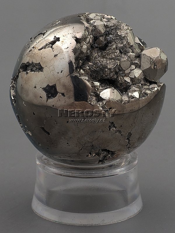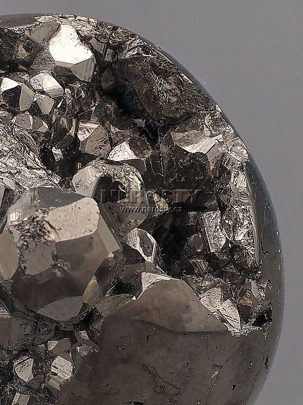 Kovově lesklá pyritová koule s dutinami vyplněnými drobnými pyritovými krystaly. |