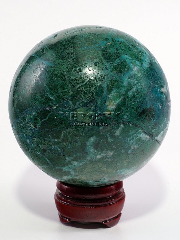Modozeleně žilkovaná chryzokolová koule s pěknou kresbou a dobrou barvou.Hnědé žilky jsou z kupritu, bílé z křemene.