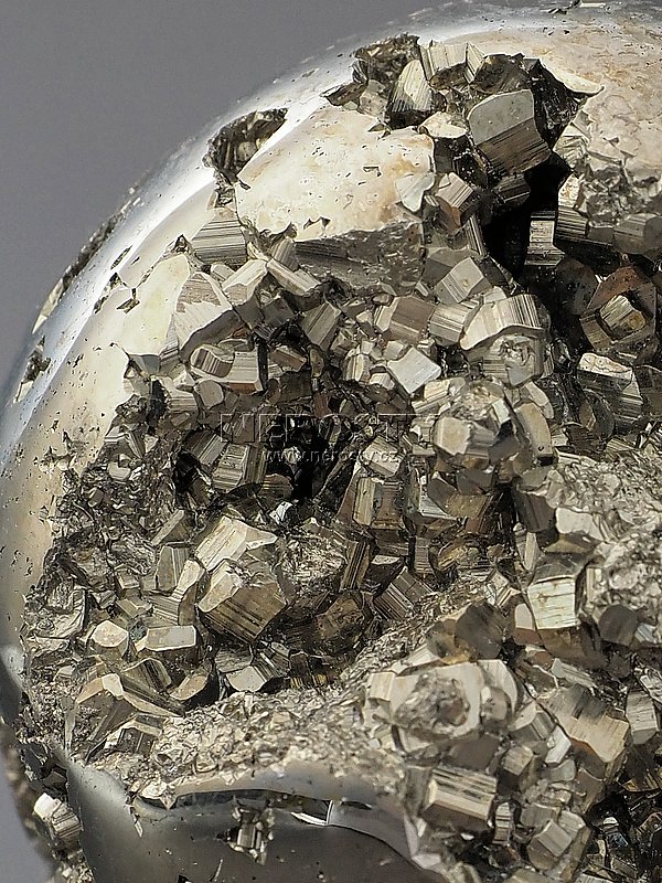 Kovově lesklá pyritová koule s dutinami vyplněnými drobnými pyritovými krystaly.