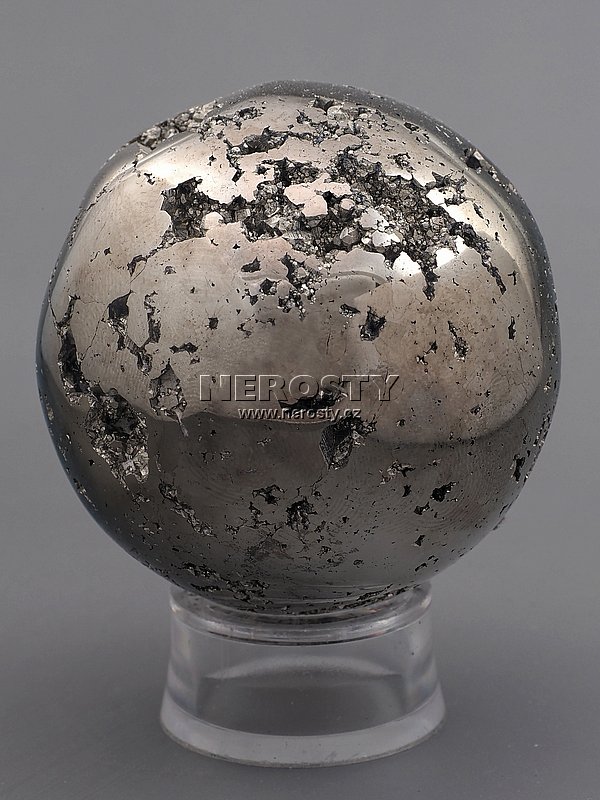 Kovově lesklá pyritová koule s dutinami vyplněnými drobnými pyritovými krystaly.