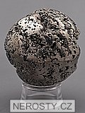 Kovově lesklá pyritová koule s dutinami vyplněnými drobnými pyritovými krystaly.