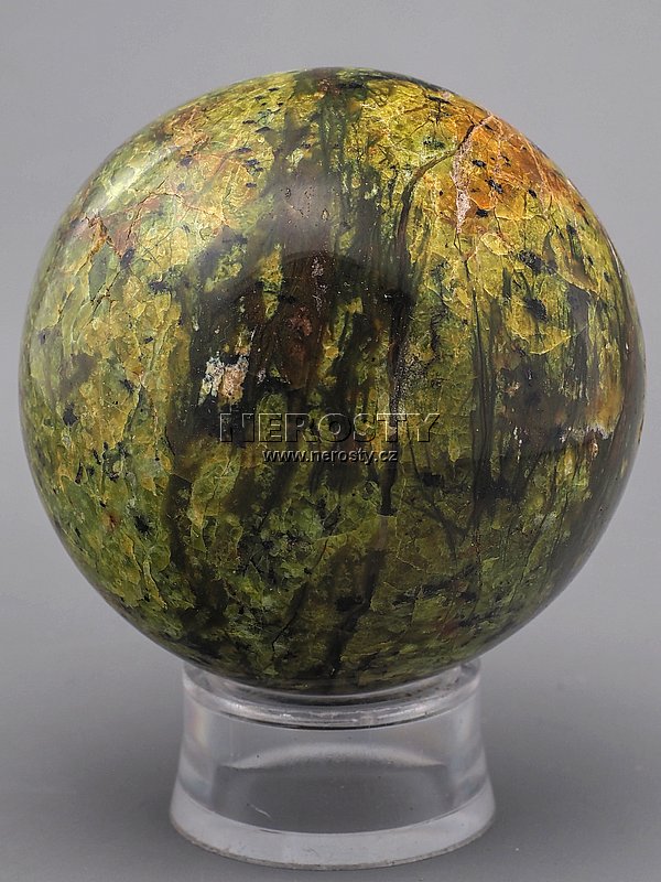 Koule ze zeleného místy hnědě zbarveného obecného opálu. |