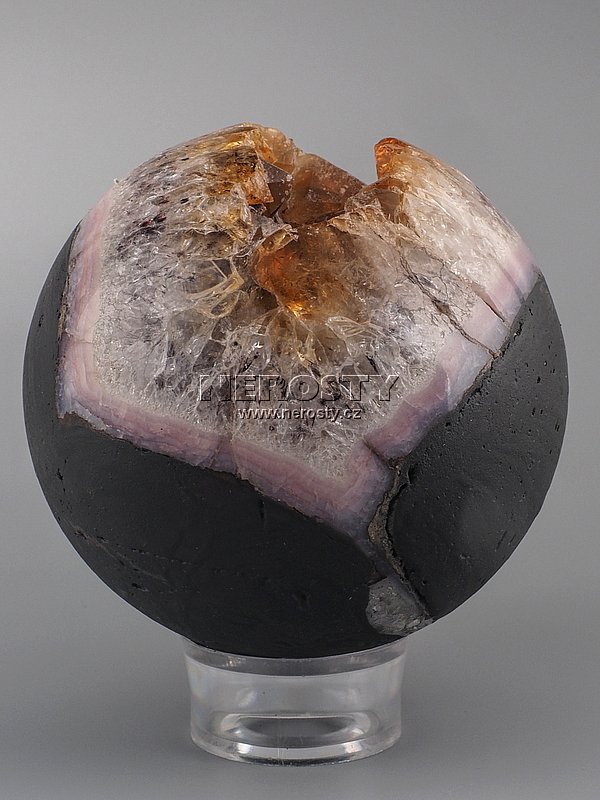 Citínová koule s krystaly je vyrobena z malé ametystové geody která žlutou barvu získala zahřátím ametystu na cca 400°C. |