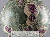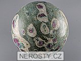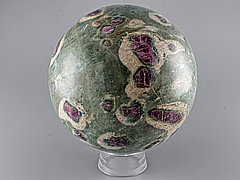 Rubín ve fuchsitu a zoisitu opracovaný do tvaru koule.Pestrobarevná je vyrobena z kusu převážně pastelově zeleného zoisitu ve kterém jsou hustě zarostlé nedrahokamové rubíny s obrubou tmavě zeleného fuchsitu, možná spíše pargasitu.