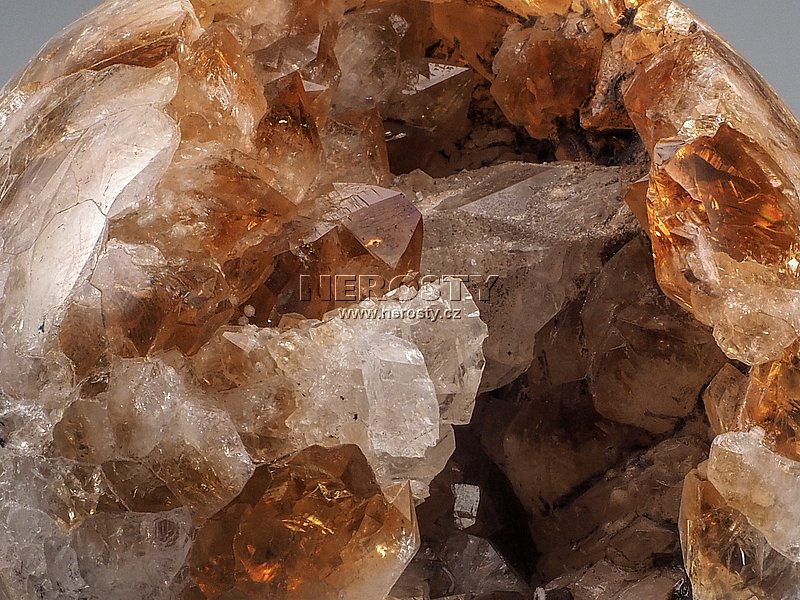 Citrínová koule s krystaly je vyrobena z malé ametystové geody která žlutou barvu získala zahřátím ametystu na cca 400°C. |