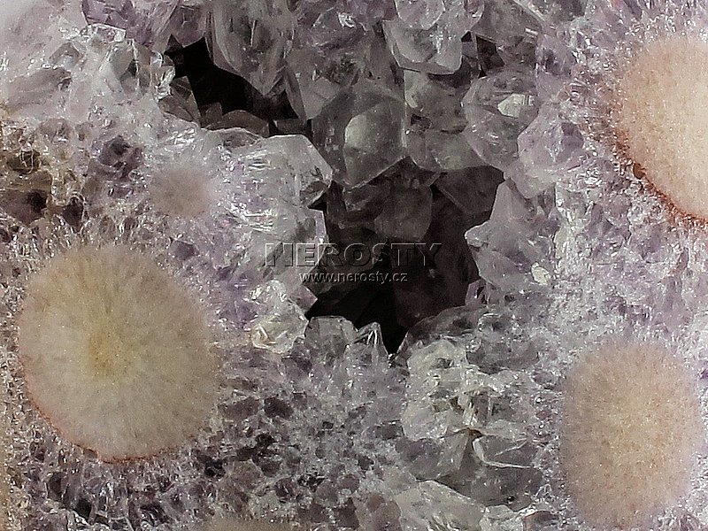Žlutavě zbarvená okatá chalcedonová koule s dutinkami vyplněnými krystalovaným ametystem a křišťálem. |