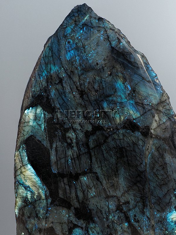 Vysoký volně stojící leštěný kus labradoritu s intenzivní barvoměnou v mnoha odstínech modré v celé ploše.Labradoritový blok je leštěný pouze z pohledové strany, zbytek kamene je hrubý.