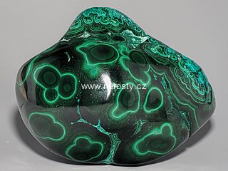 Jako mužská pěst velký kus leštěného malachitu s velmi výraznou kresbou.Modrá krajková kresba kolem jeho hrubě tvarované podstavy je tvořena chryzokolem.
