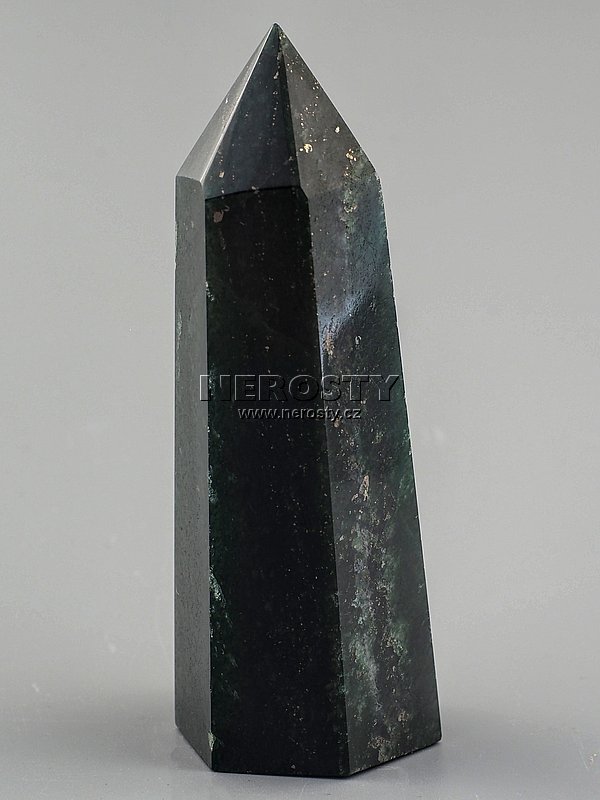 Nepravidelná šestiboká špice vyrobená z tmavě zeleného avanturínu. |