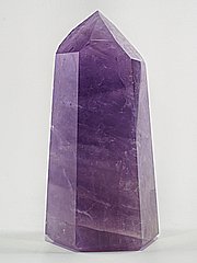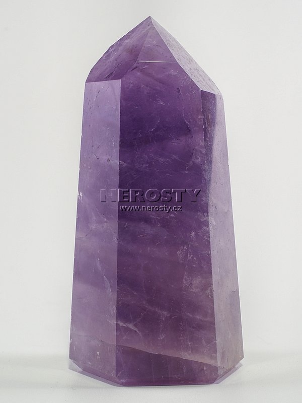 Nepravidelný šestiboký hrot vybroušený z kusu nestejnoměrně vybarveného ametystu. |