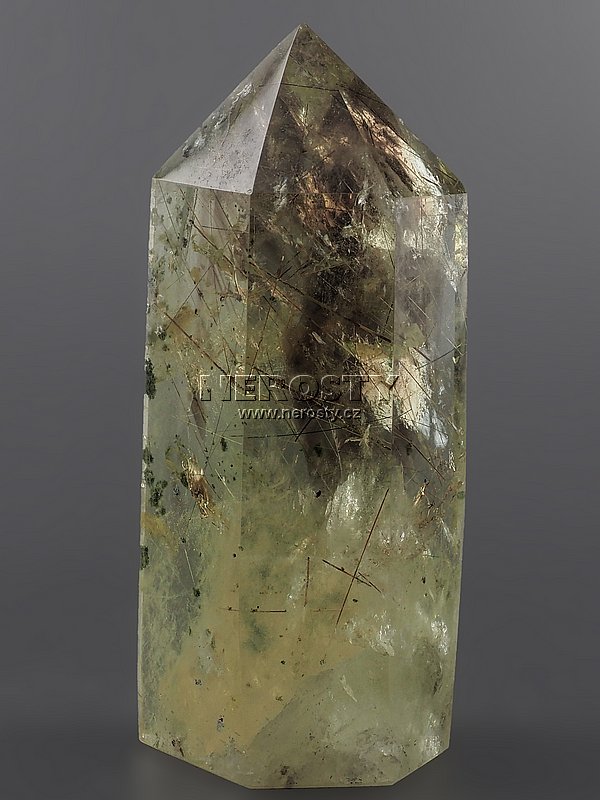 Špice ve tvaru krystalu vybroušená z nepravého citrínu který byl původně záhnědou.V těle je zarostlé poměrně velké množství jehlicovitých krystalu rutilu.